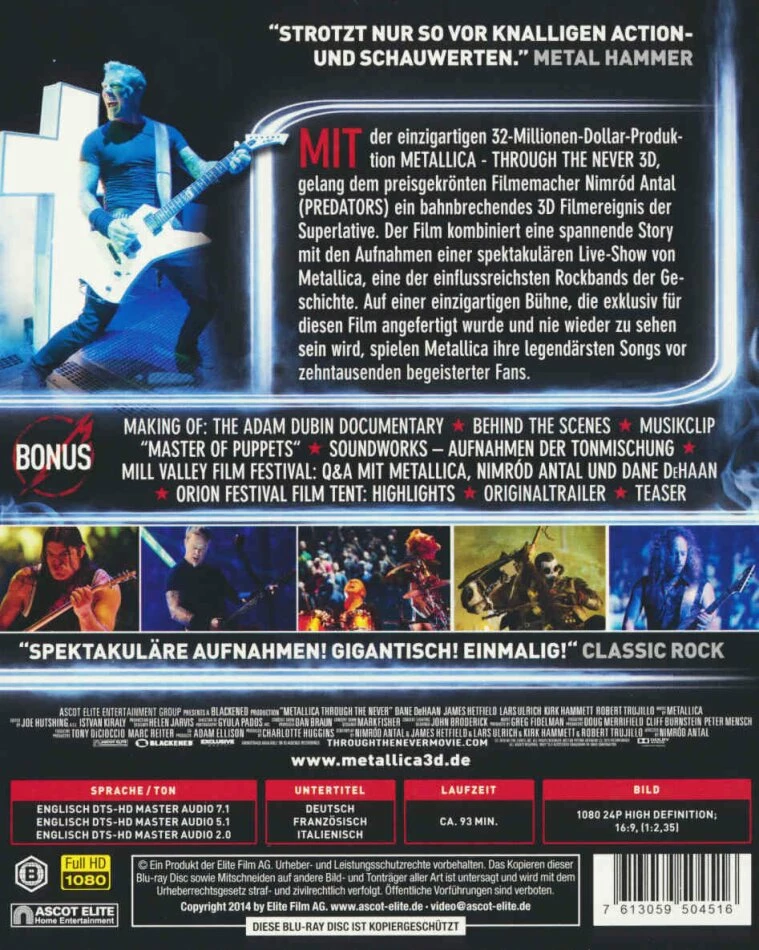 Metal Up Your Ass! Metallica, eine der erfolgreichsten wie einflussreichsten Rockbands weltweit, lädt im Herbst 2013 zum Headbanging ganz besonderer Güte ein: Mit « Metallica – Through The Never 3D », einer spektakulären 32 Millionen Dollar-Produktion für die grosse Leinwand, werden die Säle der 3D-Kinos zu Rockarenen. Für dieses einzigartige Kinoerlebnis liess die mit neun Grammy Awards ausgezeichnete Band eigens eine gigantische Bühne für über 15 Millionen Dollar entwerfen, die so nie wieder zu sehen sein wird, insgesamt 36 3D-Kameras filmten das Konzert. Lauter. Schneller. Härter. Like Never Before! Regisseur Nimród Antal (« Predators », « Motel », « Kontroll ») führt in « Metallica – Through The Never 3D » ein mitreissendes Konzert der Rock Stars mit einer fiktionalen Story zusammen: Während Metallica vor ausverkauftem Haus die ganz grosse Bühne rocken, hat ein junges Crew-Mitglied eine dringende Mission zu erfüllen, die sich zu einem verrückten Trip entwickelt. Für die Rolle des Roadies Trip konnte Shooting Star Dane DeHaan (« The Amazing Spider-Man 2 », « The Place Beyond the Pines », « Chronicle – Wozu bist du fähig? ») gewonnen werden. Metallica ist eine der grössten Rockbands aller Zeiten. Mit Alben wie « Kill ‘Em All » oder « Master of Puppets » setzte sie im Metal-Genre neue Massstäbe und eroberte Anfang der 90er Jahre mit ihrem « The Black Album » auch das Mainstream-Publikum. Nach wie vor füllen sie Stadien auf der ganzen Welt und haben bereits über 100 Millionen Alben verkauft.